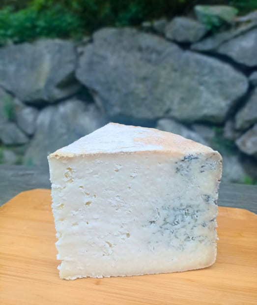 De pasta marfil y veteado azul verdoso, presenta una textura firme y compacta, con corteza natural comestible que añade un sutil toque salino.